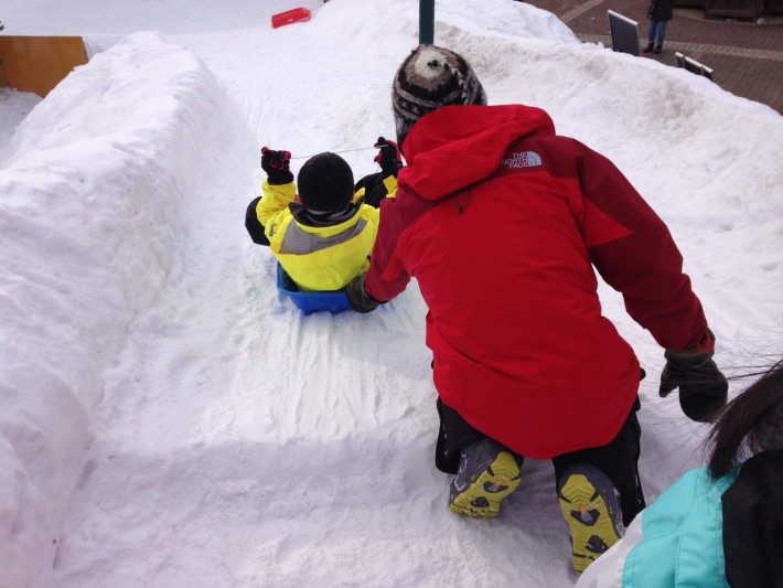レラ様にこのためだけに立派な「ソリ山」を作っていただき、ソリを持った多くの子供たちが集まってくれました。