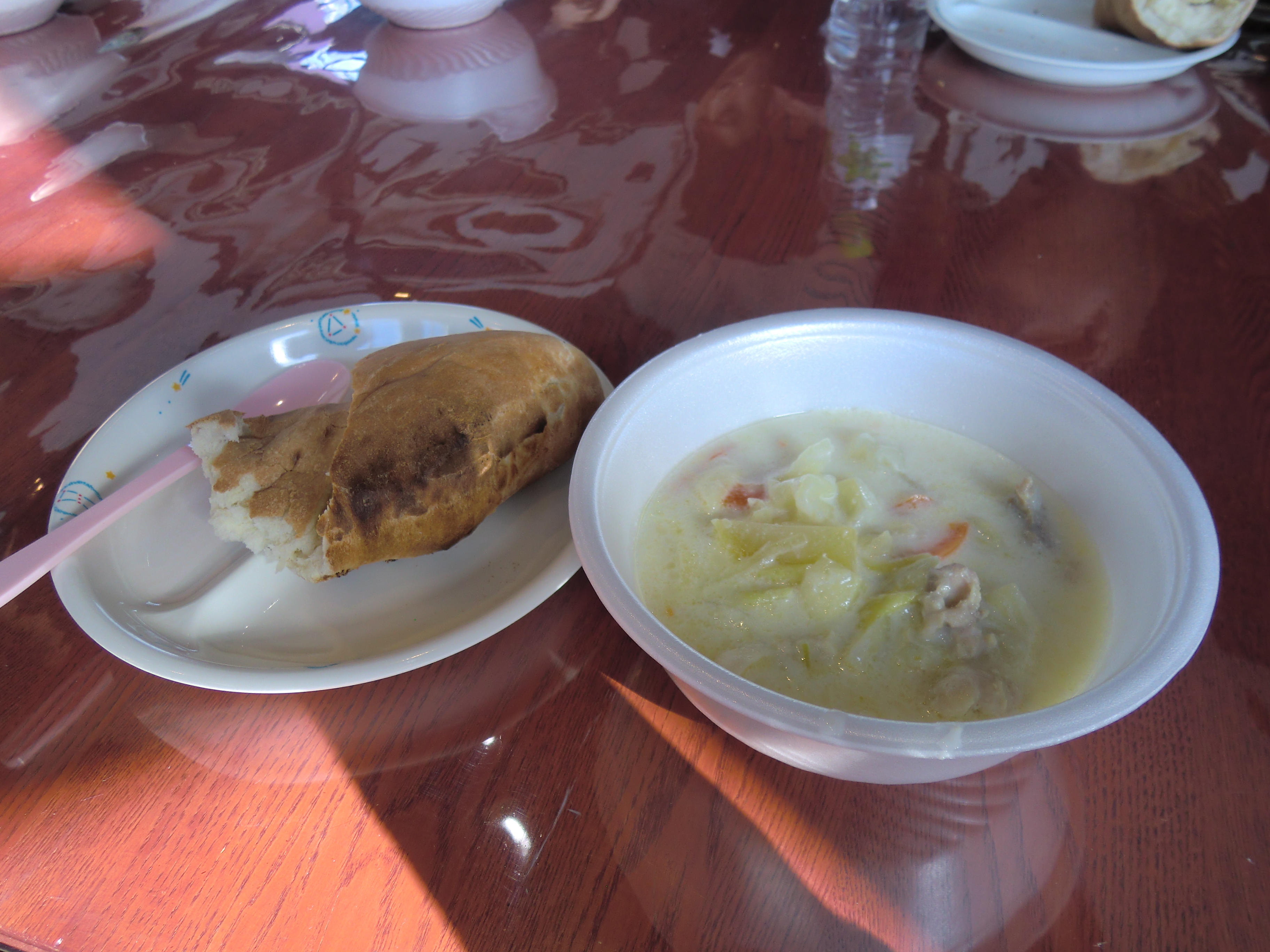 午前中は雨煙別小学校コカ・コーラ環境ハウスにて棒巻パンとシチュー作り。